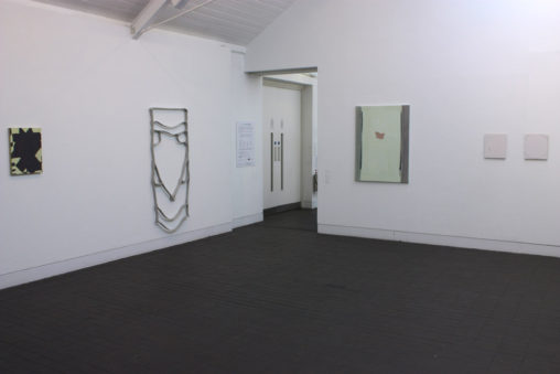 Playing with the process of painting, and of abstraction, David Webb‘s now familiar ‘Parcheesi’ form becomes star-like against a blue/green ground in one reading, or alternatively, a figure emerges…